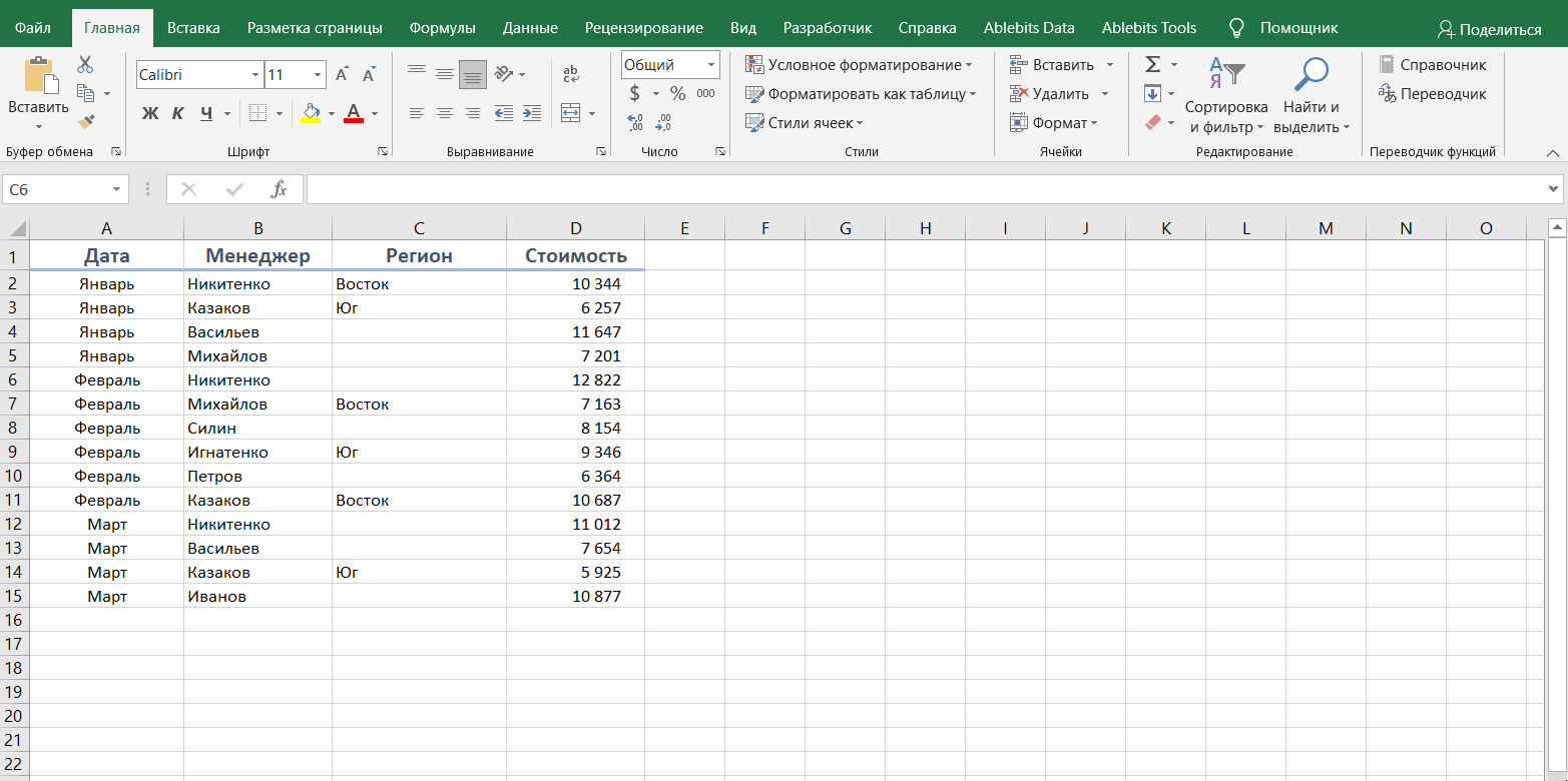 Вот наши данные о продажах в разрезе менеджеров и регионов. Некоторые из продавцов работали в нескольких регионах, сведения об их продажах записаны друг под другом. Также объединены ячейки месяцев. Таблица выглядит достаточно читаемо. Однако, если нужно будет отфильтровать или просуммировать данные по менеджерам, или же найти сумму продаж по региону за определенный месяц, то сделать это будет весьма затруднительно. Этому будут мешать пустые и объединенные ячейки.