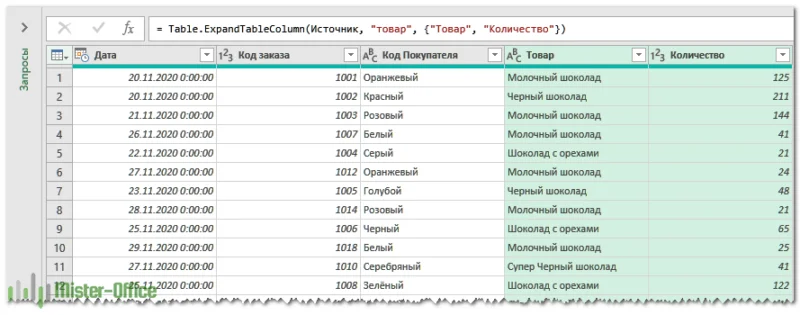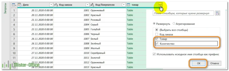 После выполнения вышеуказанных шагов редактор Power Query покажет вашу первую таблицу (Заказ) с одним дополнительным столбцом. Он будет назван как ваша вторая таблица (Товар) и добавлен в конец. В нём пока нет значений, только слово «Таблица» во всех ячейках. Но не расстраивайтесь, вы все сделали правильно, и мы скоро это исправим!