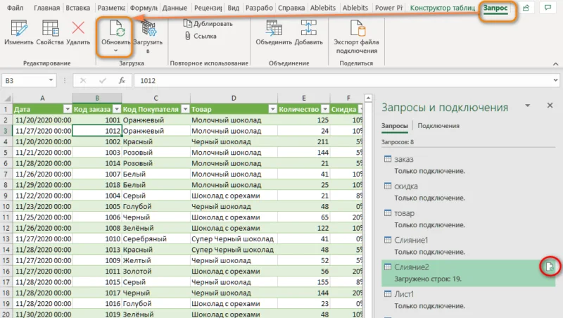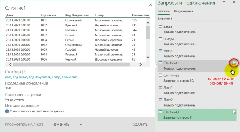 Кроме того, вы можете нажать кнопку «Обновить все» на вкладке «Данные» или кнопку «Обновить» в запросе (эта вкладка активируется после выбора любой ячейки в объединенной таблице).