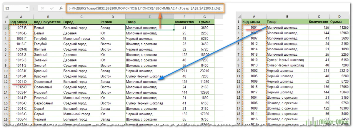 В случае нечёткого совпадения кодов заказов, который мы рассматривали выше, комбинация ИНДЕКС + ПОИСКПОЗ позволяет обойтись без вспомогательной колонки.