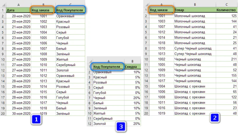 Предположим, у вас есть две таблицы на двух разных листах: основная содержит коды заказов и покупателей (то есть, кому вы продаёте), а во второй записаны заказы и товары (то есть, что вы продаёте). Вы хотите объединить их, сопоставив данные в колонке Код заказа: