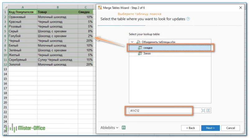 - Убедитесь, что программа правильно выбрала диапазон ячеек, и нажмите Далее (Next).