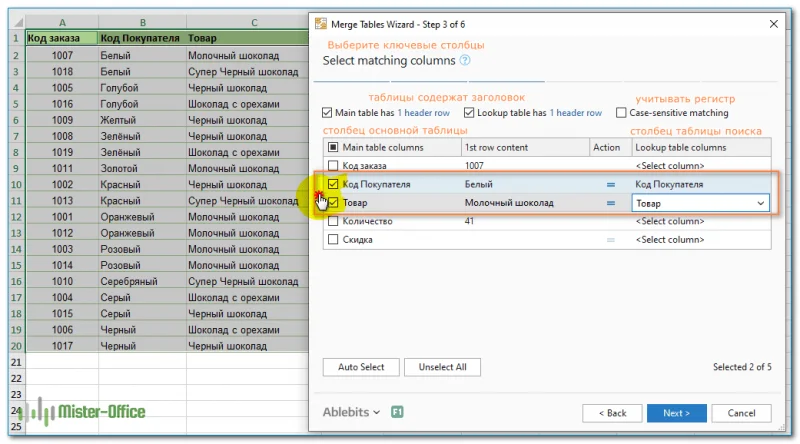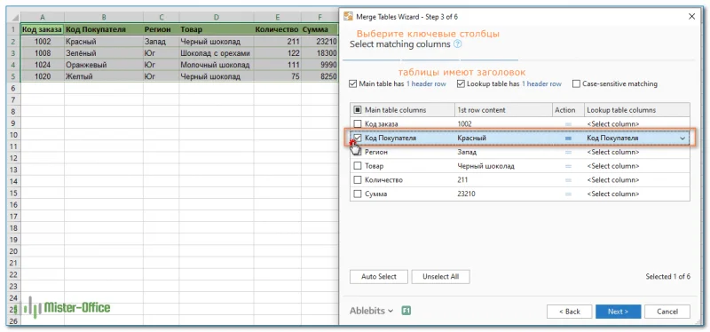 Шаг 3. Выберите «Код покупателя» и «Товар» как ключевые столбцы.