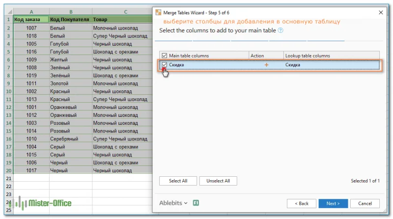 - Выберите столбцы, которые нужно добавить в основную таблицу, и нажмите « Далее». Добавляем скидку, как и планировали.