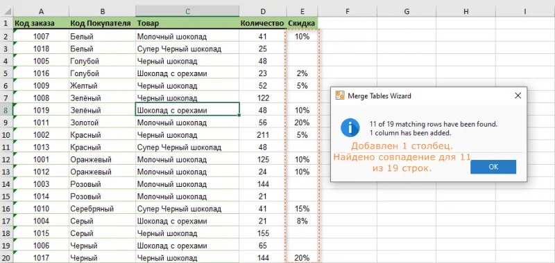 - Добавлен столбец «Скидка» путем сопоставления имени продавца и наименования товара в обеих таблицах.