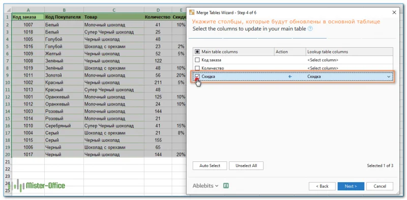 Шаг 4. Выберите столбец «Скидка» для обновления. То есть, в этот столбец основной таблицы будут перенесены обновленные значения из соответствующего столбца из таблицы поиска. Параметры этого добавления вы укажете чуть позже.