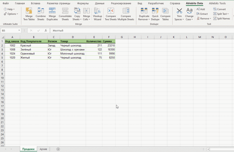 В этом примере мы будем использовать уже знакомые по предыдущим разделам этой статьи таблицы и объединять их на основе 2 столбцов: «Код покупателя» и « Товар».