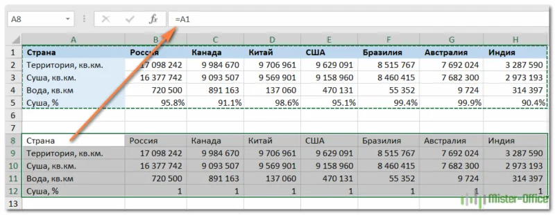 Теперь соединяем эти функции, чтобы получить нужную нам ссылку на исходную таблицу. Предположим, координаты её верхнего левого угла – A1.