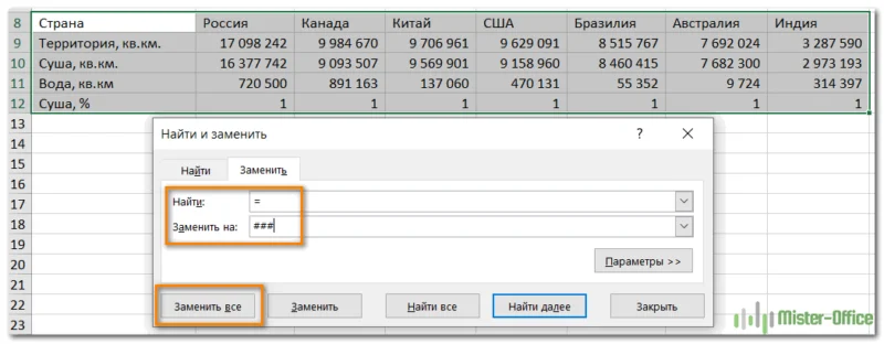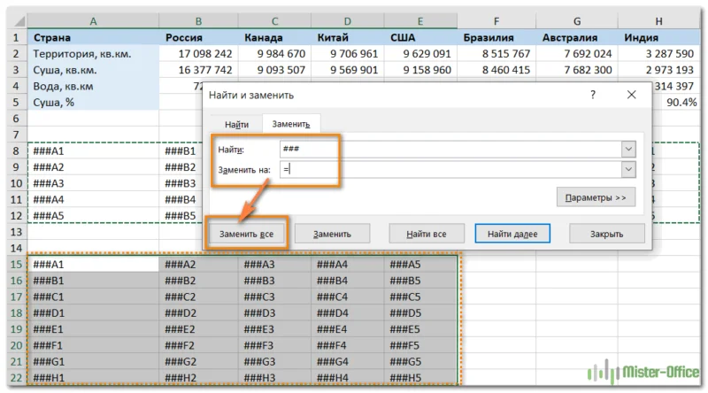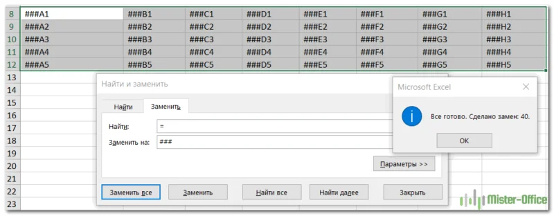 - Наконец, откройте диалоговое окно «Найти и заменить» еще раз, чтобы отменить изменение, т.е. обратно заменить все «###» на «=», и восстановить ссылки на исходные данные.