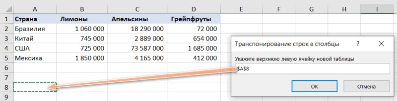 Ваша новая таблица будет содержать такое же количество значений, но данные теперь будут располагаться не по строке, а вертикально, по столбцам. Итак, вы выбираете диапазон пустых ячеек, который занимает то же количество строк, что и исходная таблица имела столбцов, и такое же количество колонок, как исходная таблица – строк.