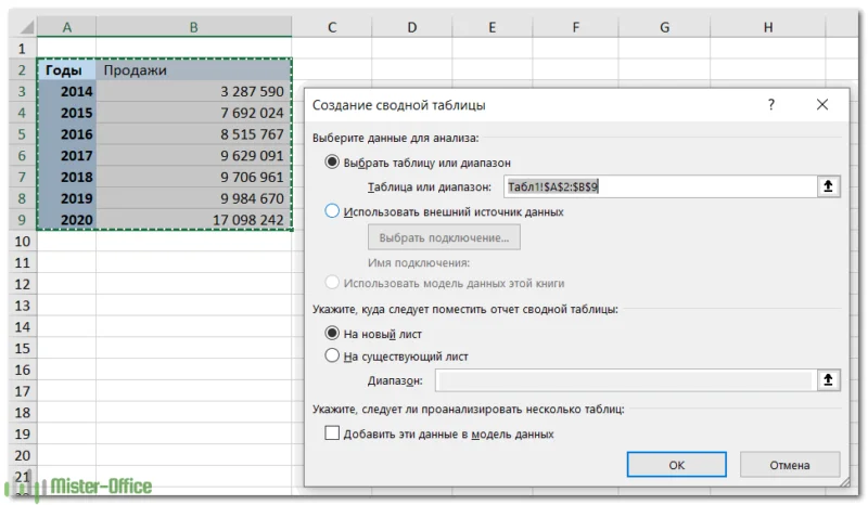 Затем выберите исходный диапазон с помощью мыши или введите его вручную: