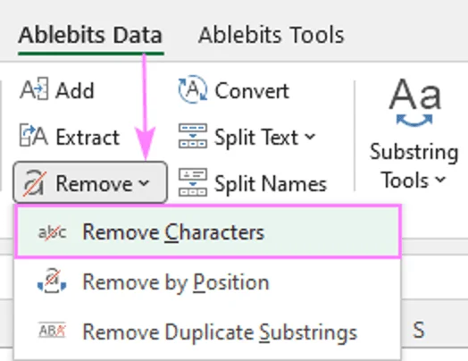 - На вкладке « Ablebits Data» в группе «Text» нажмите «Удалить» > «Удалить символы» .