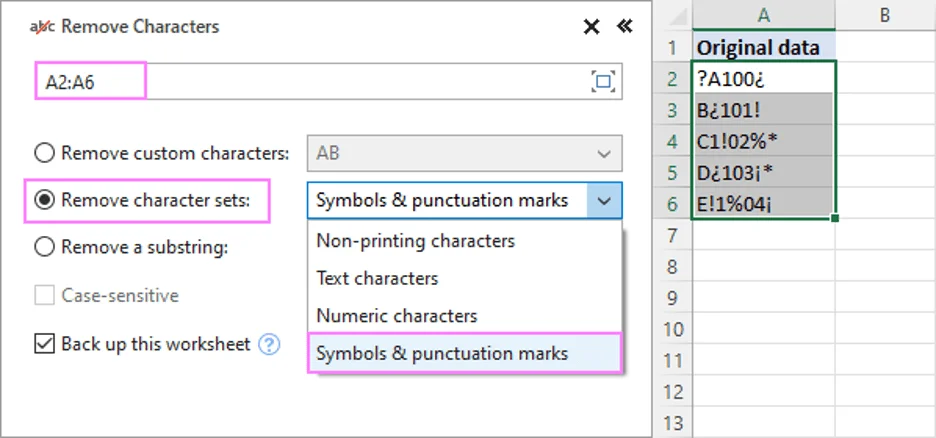 - На панели надстройки выберите исходный диапазон, выберите «Удалить наборы символов» и выберите нужный вариант из раскрывающегося списка ( в данном примере — символы и знаки препинания ).