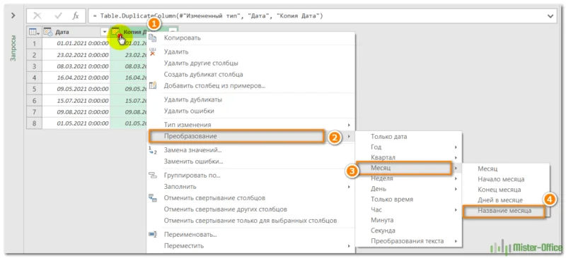 Надстройка Excel Power Query может помочь вам перевести дату в месяц и извлекать его номер или название.