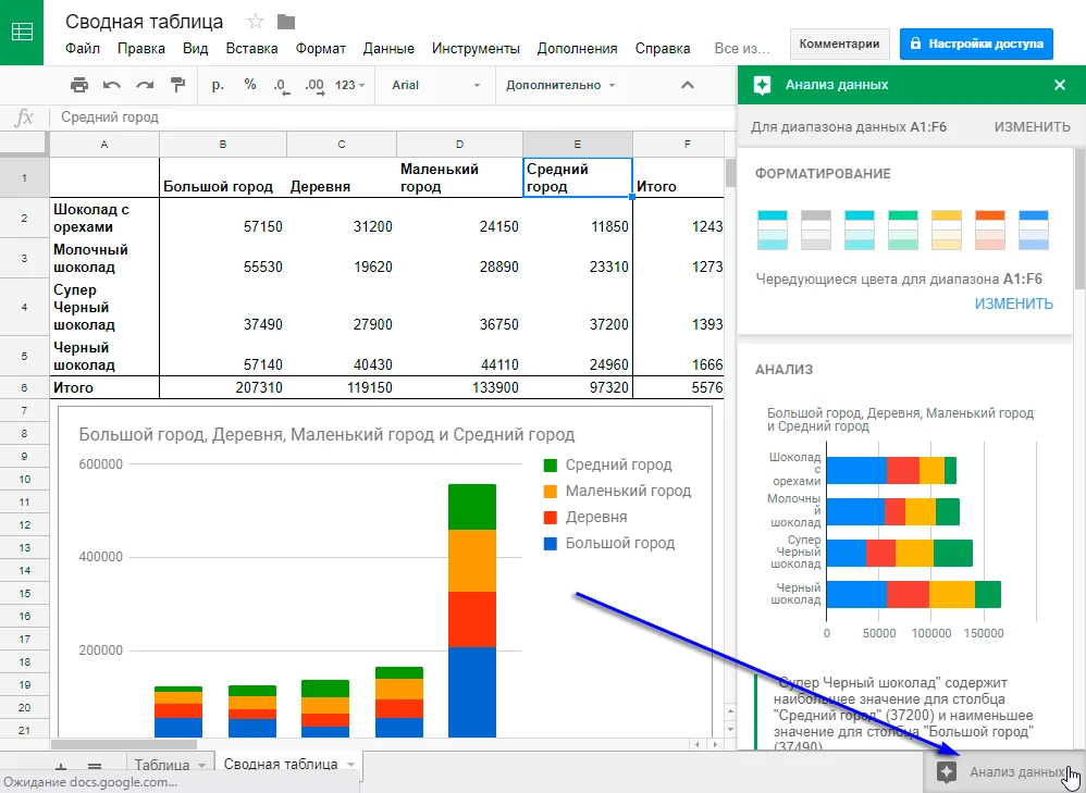 В Google таблицах есть дополнительный сервис, которого ранее не было ни в одной из программ работы с таблицами. В правом нижнем углу есть кнопка "Анализ данных". Нажимая на нее, вы можете получить различные подсказки и предложения по улучшению представления ваших данных, их анализу, в том числе и созданию диаграмм.