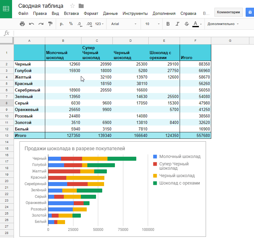 К примеру, рассчитаем продажи различных видов шоколада в разных городах.