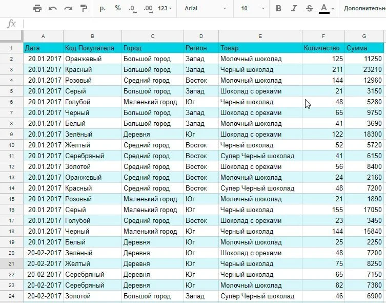 Вот как, к примеру, выглядят данные о ваших продажах, хранящиеся в Google таблице.